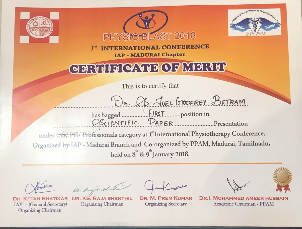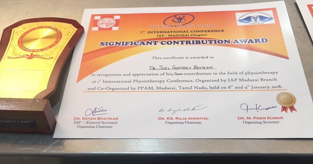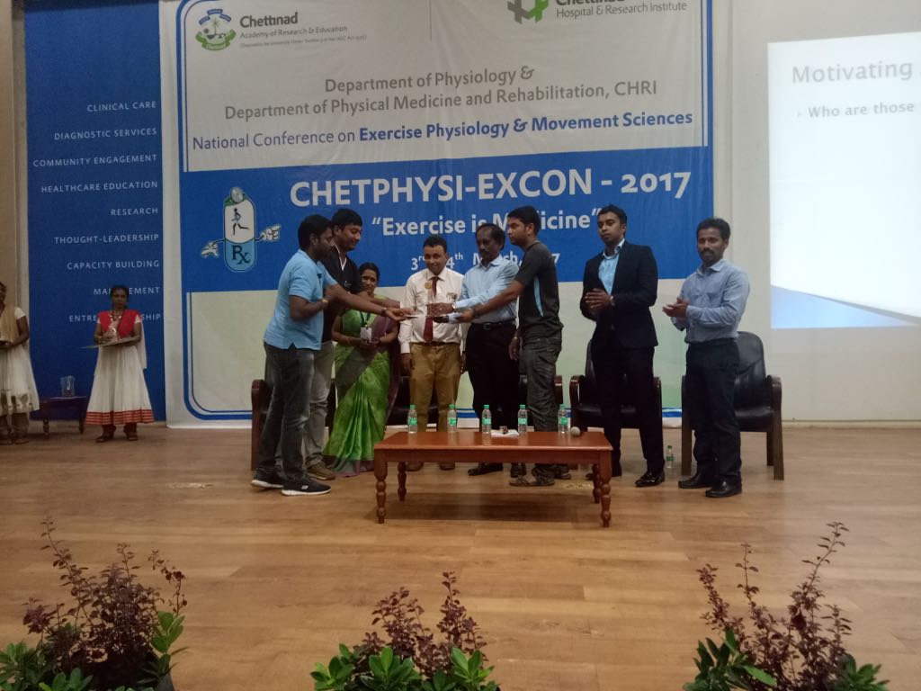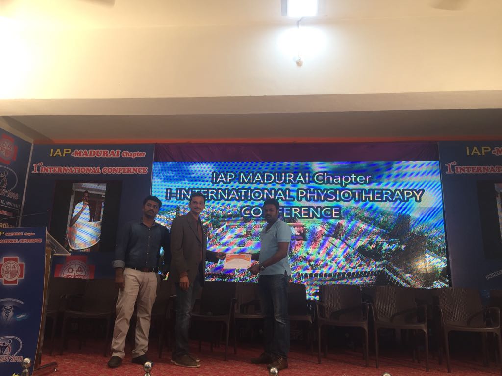 SPARRC institute participated and emerged victorious at various Sports Physiotherapy conferences conducted across the country this year. Mr.Joel representing SPARRC institute won first place in paper presentation at the CHETIPHYSIEXCON,   International conference for Physiotherapists (IAP) Madurai and at PHYSIOBLAST to name a few. Our papers have been chosen to feature in International Journals. Mr.Joel has been chosen to speak at the International conference at Ireland. We also congratulate Mr.Harikrishnan on his paper presentation at SAICON,Delhi, PHYSIOBLAST and at the conference held at Avinashilingam University.    Mr.Manikandan had represented SPARRC at PHYSIOBLAST and Mr.Rajaseelan presented a paper at Avinashilingam University. Ms.Banu and Ms.Thillai participated with a  poster presentation at the conference held at Avinashilingam University. We have also presented papers at conferences conducted by  Alagappa University, Ramakrishna Vidyalayam and Bharathiar University this year.